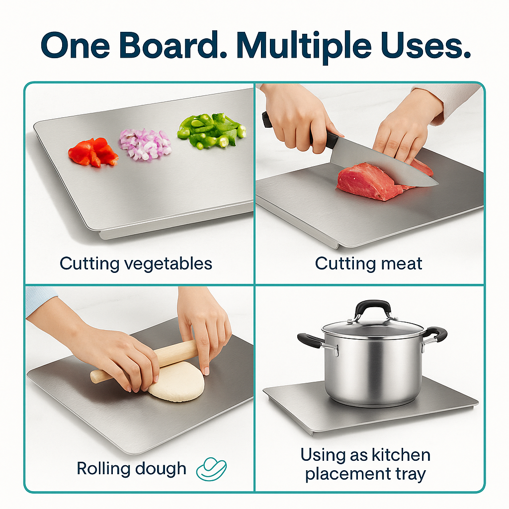 Customers love how effortless their daily cooking becomes with this stainless steel board. It keeps the kitchen cleaner, makes prep faster and feels far more hygienic than traditional wooden or plastic boards. Most users say it instantly improved the way they cut, clean and cook every day.